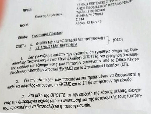 Σύμφωνα με το υπ’ αριθ. Φ 449 Α /7/1070913/12-6-2019 έγγραφο του Γενικού Επιτελείου Στρατού , ικανοποιεί το σχετικό αίτημα που είχε καταθέσει η ΟΠΟΤΤΕ (Ομοσπονδία Τριτέκνων Ελλάδας ) σε συνάντηση που είχαμε μαζί του.